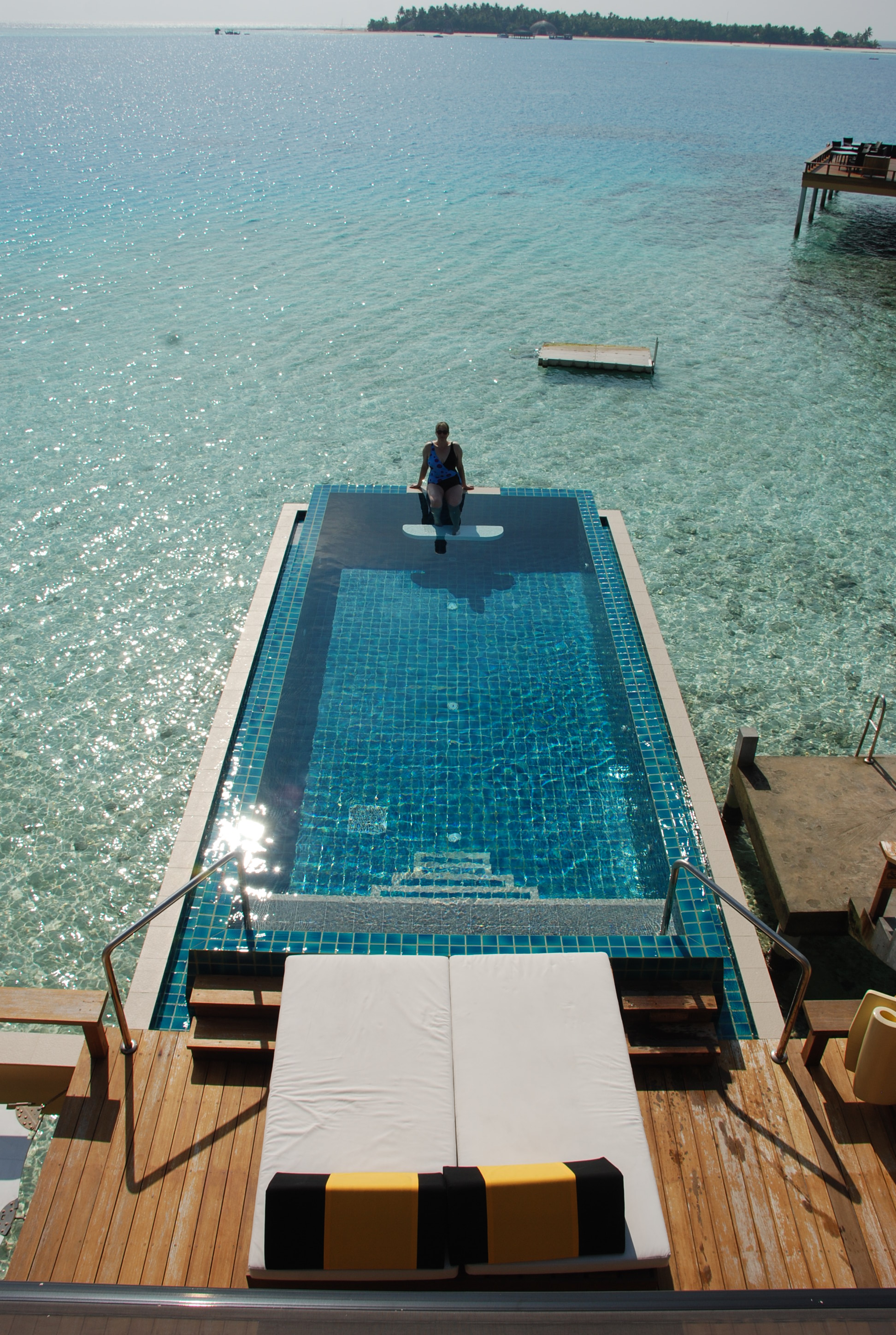 My sister Katrina enjoys our private pool at the in-ocean villa.