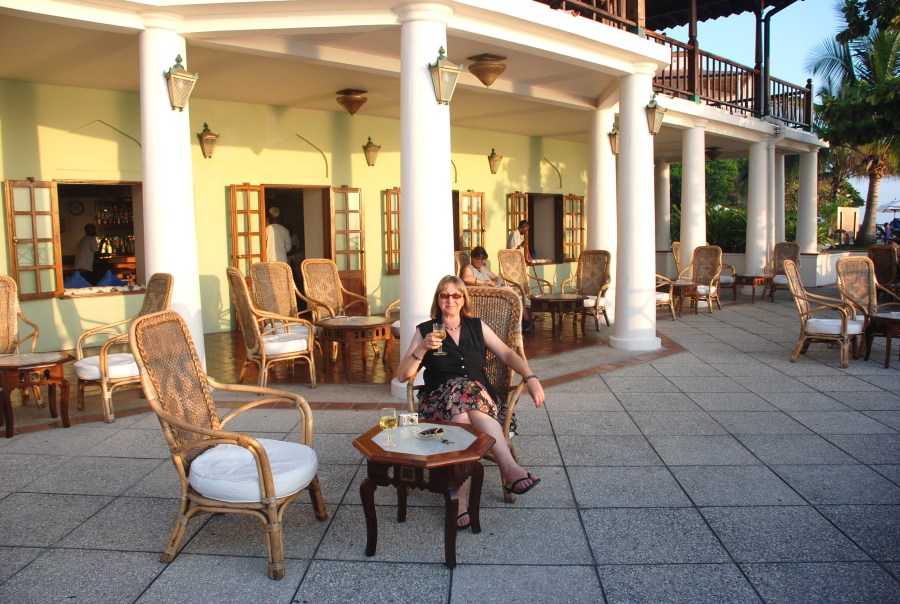 My sister Katrina enjoying libations on the Serena Hotel’s patio at sunset.