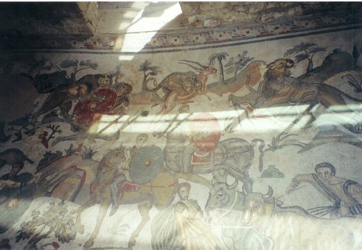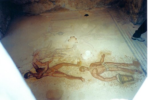 We left Agrigento with Piazza Armerina and the Villa Romana del Casale as our destination. The Villa, a Roman retreat from the 4th century AD, is a UNESCO World Heritage Site. We arrived early in the morning, and were the first visitors at the site. That made a huge difference in our enjoyment of the frescoes, no crowds. The colorful mosaics have been uncovered and restored, an ongoing project. In the photo below, you can see my sister on the observation platforms.