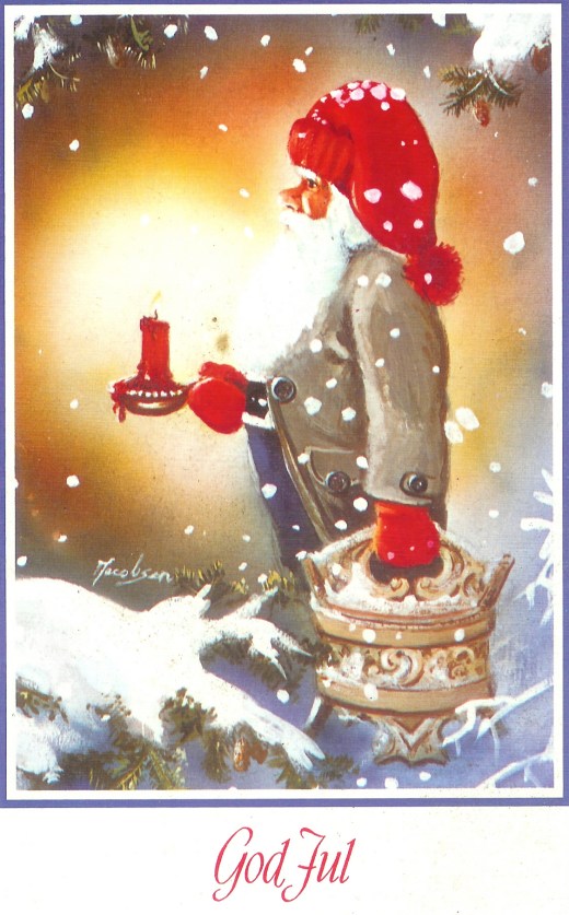 In an earlier post, I wrote that my family is a card family. We like to send and receive beautiful cards. I like to think of cards as affordable art, a way to put a smile on someone’s face and brighten their day. I keep most of the cards I receive, storing them in pretty hat boxes. The Christmas cards I keep in a separate box, so I can look at them each year at Christmas. Having aunts, uncles and cousins in Scandinavia, I receive Christmas cards every year from Norway and Sweden. They are some of my favorites. My parents kept up Scandinavian Christmas traditions, so we grew up familiar with Sweden’s Tomten and Norway’s Nisse Man. They feature prominently in the Scandinavian Christmas cards, just like Santa Claus does in the US. I have selected a sampling of some wonderful cards from past Christmases. I hope you enjoy them.