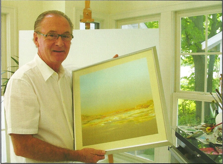 The artist Max Matteson holding one of his popular “Horizon Series” paintings described as minimalist in nature, giving a sense of pleasure, rest, and repose.