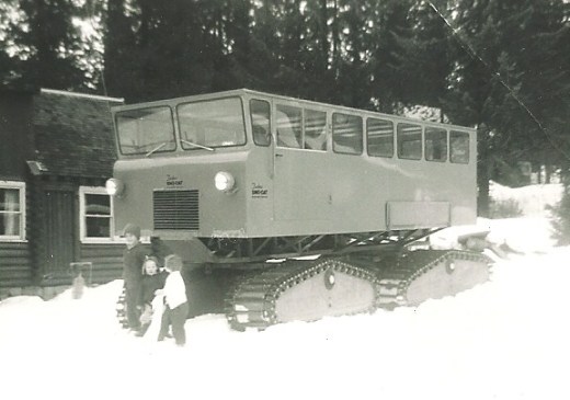 This sno-cat is parked in front of my parent's log cabin in Government Camp, Oregon, Jan. 1961. My sister, three years old in this photo, is standing in front of the sno-cat.