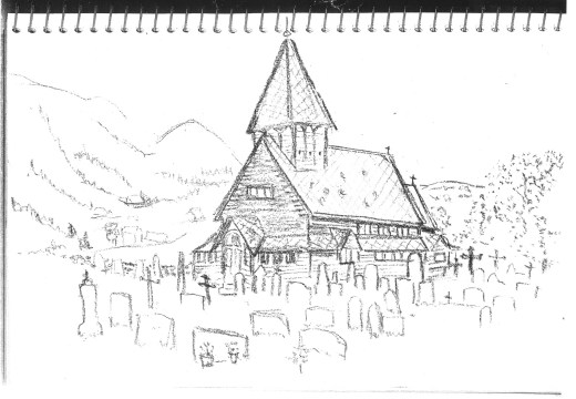 My mother’s sketch of the Røldal Stavkirke in Norway.