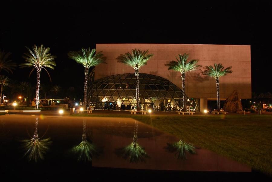 The new Dali Museum at night. It is in a beautiful location with grass terraces and a grove of lighted trees.