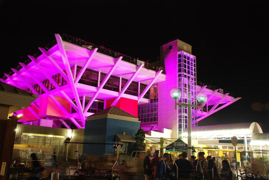 The Pier, at night. The exterior has an ever changing light show of its own, from yellow, to green, blue, red and pink.