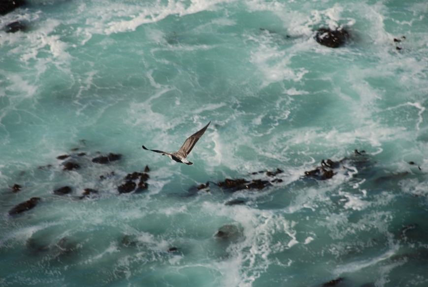 A seagull from above, and the churning waters of the Cape of Good Hope.