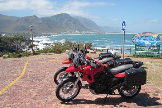We left Cape Town on the N2, three lanes wide, and well-marked. From the N2 we turned off on the R44 southbound. This next stretch turned out to be the best biking road of the day. It is small and winding and follows the coastline, and is also known as the Whale Coast Route. During the winter months here in the southern hemisphere, the southern right whale, humpback whales, and sperm whales can be seen from the shore here. The view is spectacular and the road is fun to drive. It took us two hours to get from Cape Town to Hermanus, where we stopped for lunch.