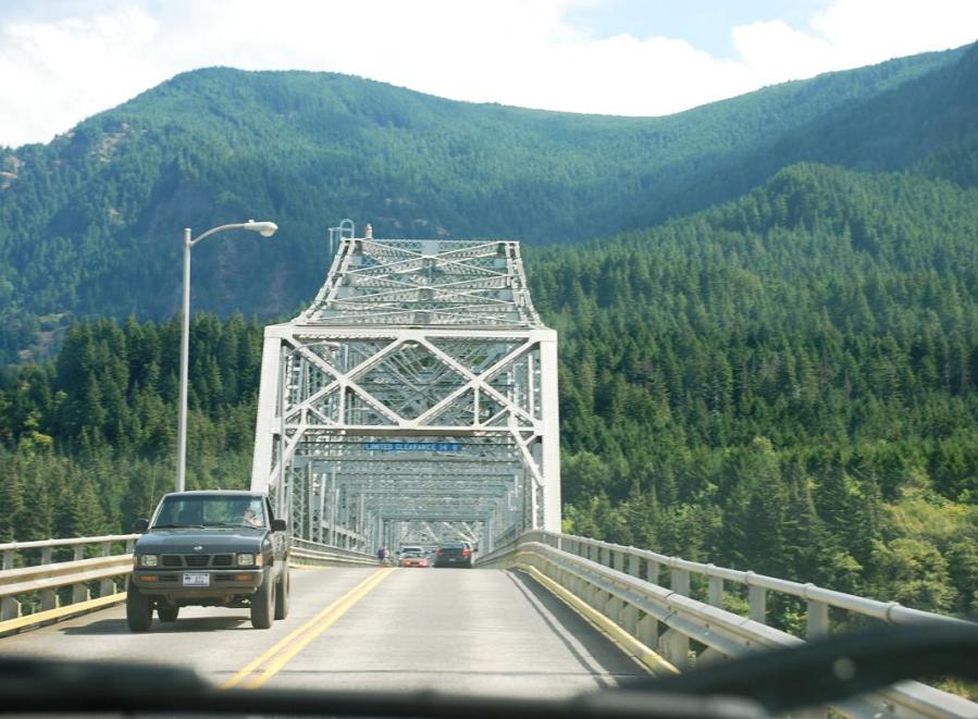 Crossing the “Bridge of the Gods” from Washington state to Oregon. The bridge is near Stevenson on the Washington side, and crosses to Cascade Locks on the Oregon side.