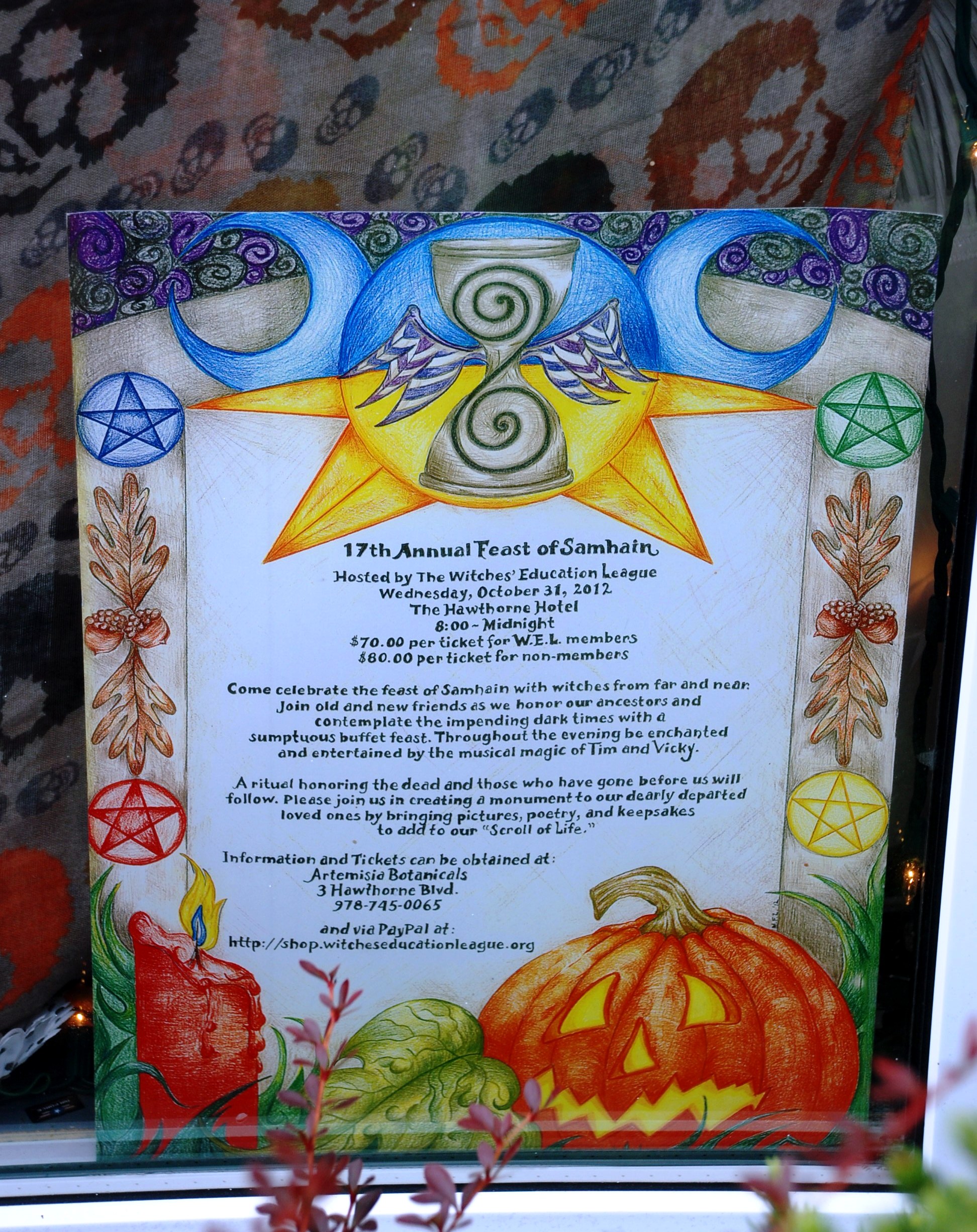 A sign in a consignment shop window advertising the “17th Annual Feast of Samhain”, hosted by The Witches’ Education League.