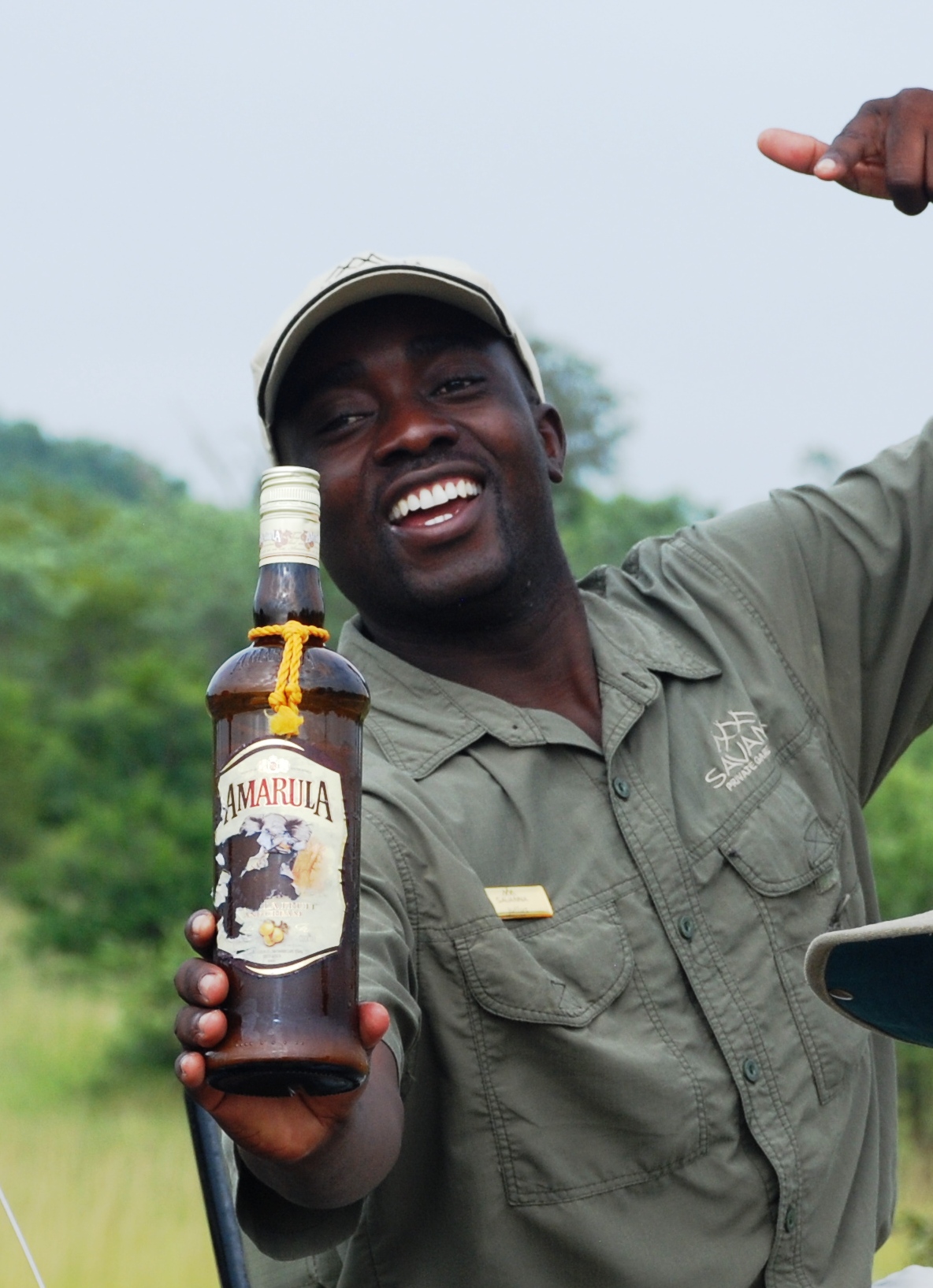 On the way back to the lodge we stopped for a break of coffee and snacks.  Patrick and Julius had also packed a bottle of Amarula, and without much arm twisting talked us into a splash of Amarula in the morning coffee.  It was great.  Driving back to the lodge we saw a few water buck, a tree squirrel, wart hogs and a leopard.  The leopard sighting was a 1 out of 5, as Patrick described it over the radioed to the other guides.  I asked what a 1 out of 5 meant, and he said, the male leopard was “flat”.  The leopard was in a tangle of bushes, lying flat.  You could see it was a leopard, but photos were impossible.  Our lion encounter had been a 5 out of 5, where the animal is active and highly visible, with good photo opportunities.  So yes, the leopard sighting was a 1 out of 5, but it was an official sighting.  If we included the elephant sighting during the night drive back to the camp after sundowners last night (large dark shapes really), we had officially seen The Big Five (lion, leopard, elephant, water buffalo and rhino) in just 24 hours.  Patrick wasn’t satisfied though, and said we must see a leopard with a cub, and elephants in the daylight.  We did not argue.