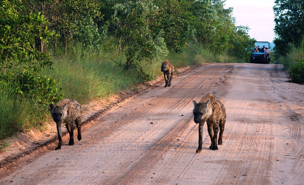 We passed the resident herds of impala and zebra, a side-striped jackal, and a lone wildebeest beating a small bush into submission. We stopped the Land Rover as three Hyenas came trotting down the road towards us. Good photo ops! Zebra grazed in the morning light, a giraffe plucked breakfast from the trees, and a yellow-billed hornbill posed as the sun came up.