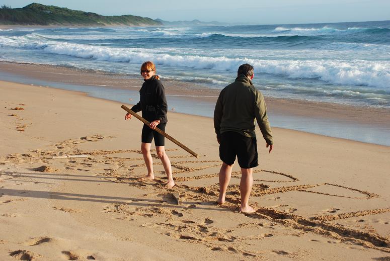 My birthday dawned sunny and bright. It would be our best beach day yet. I went out onto the deck of our room to look at the beach, and there were Augie and Teresa down on the beach writing a message for me in the sand.