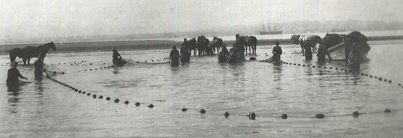 Most of the sites were a mile or more from either shore and wholly submerged by the flood tide, so as the water advanced, both humans and horses would retreat to their camp built high atop piling. On these stilted little islands the horse seining crews, usually consisting of about 30 hands, and the five to seven teams of horses spent the season.