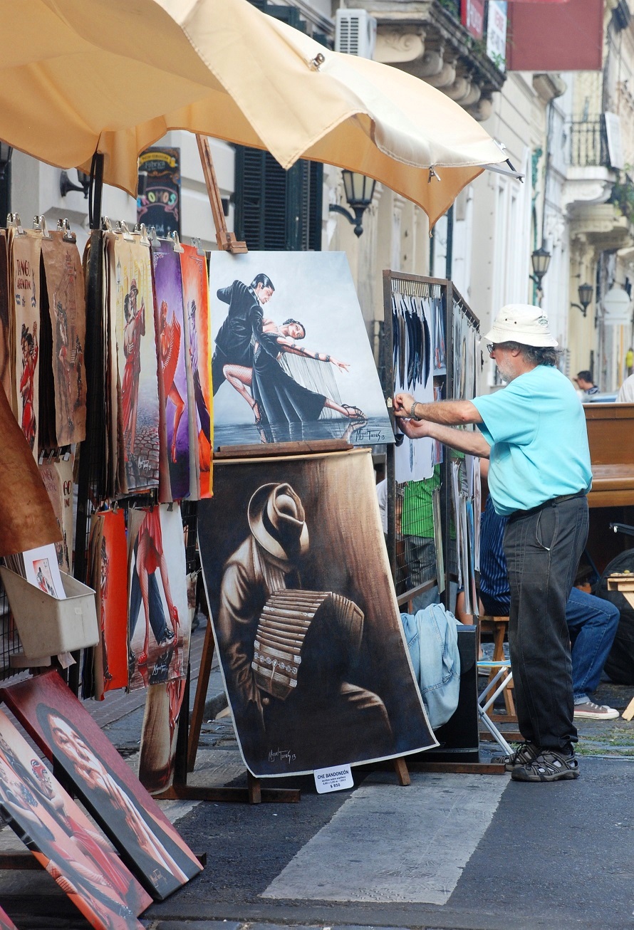 After lunch we took the subte to San Telmo for yet another street market. The subte, the underground subway, is easy to use and safe. Some of the stations have beautiful ceramic tile scenes, but the ugly graffiti is here too.
