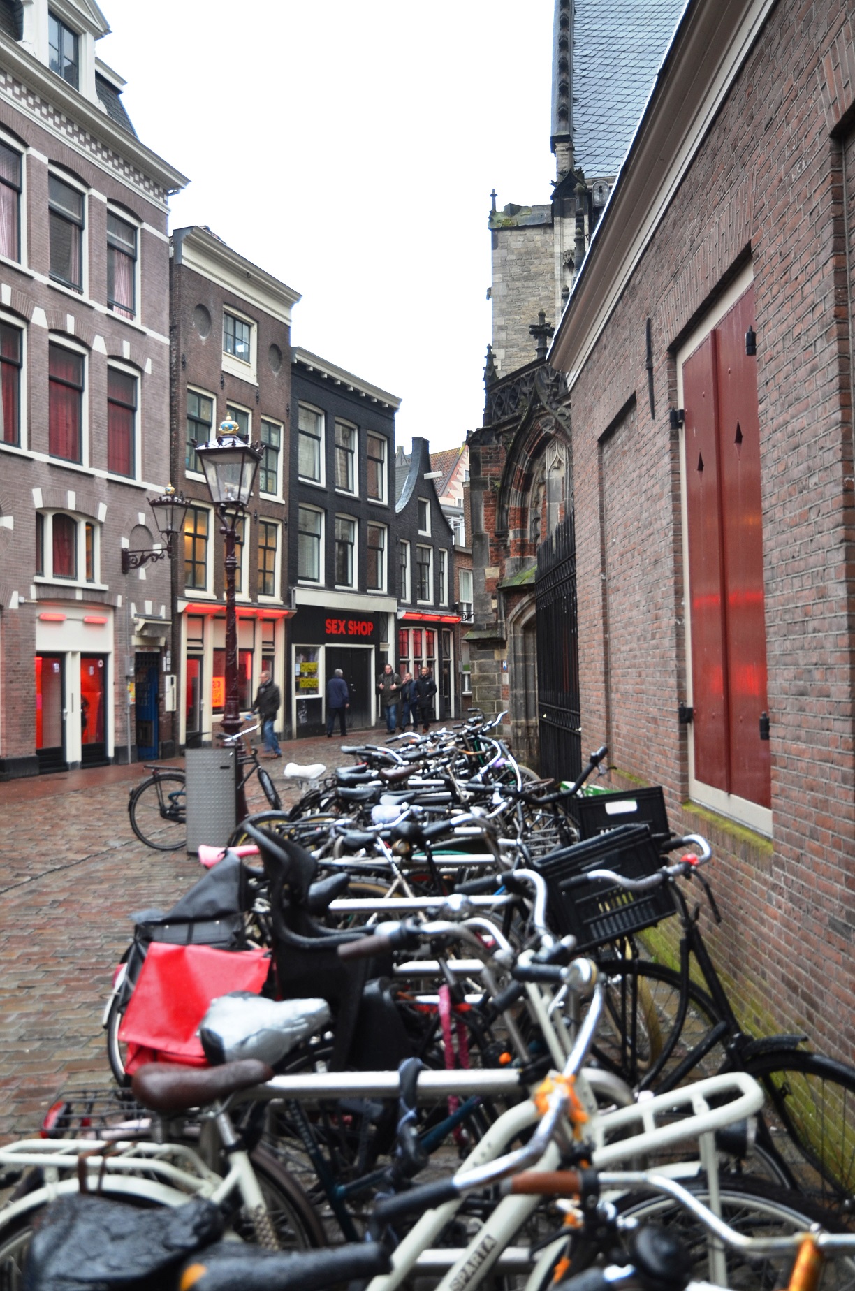 Bicycles line the back side of the oldest church with Sex Shops across the street