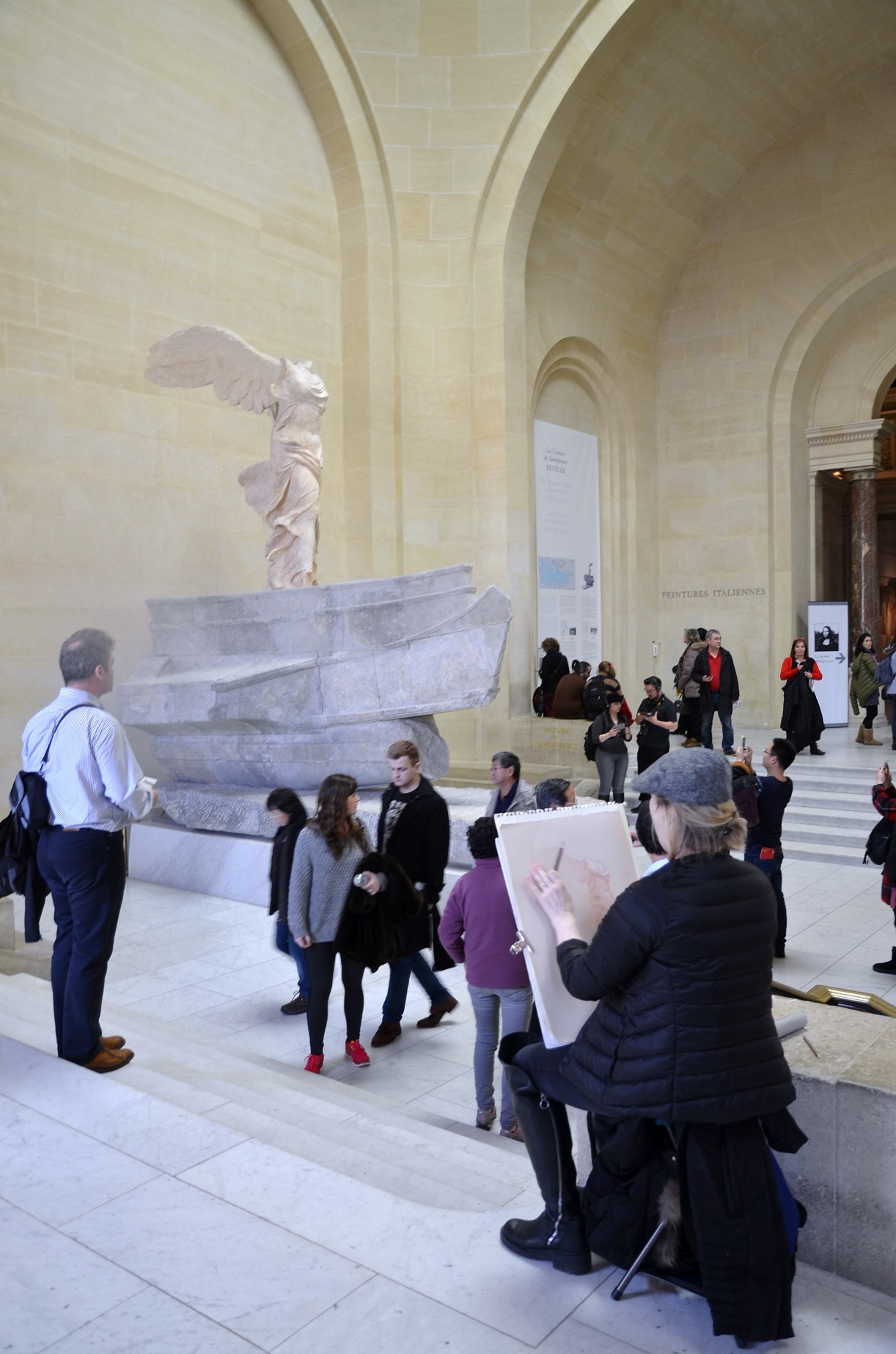 Even though our feet were aching at this point, we made our way through more than 5,000 years of art history. My all time favorite piece of artwork in any museum is The Winged Victory of Samothrace. That was our first stop. Again, photos were allowed, but the Chinese tourists who posed in front of the piece and touched it were quickly reprimanded by the attentive museum representative. It was crowded and there was even an artist sketching the masterpiece.