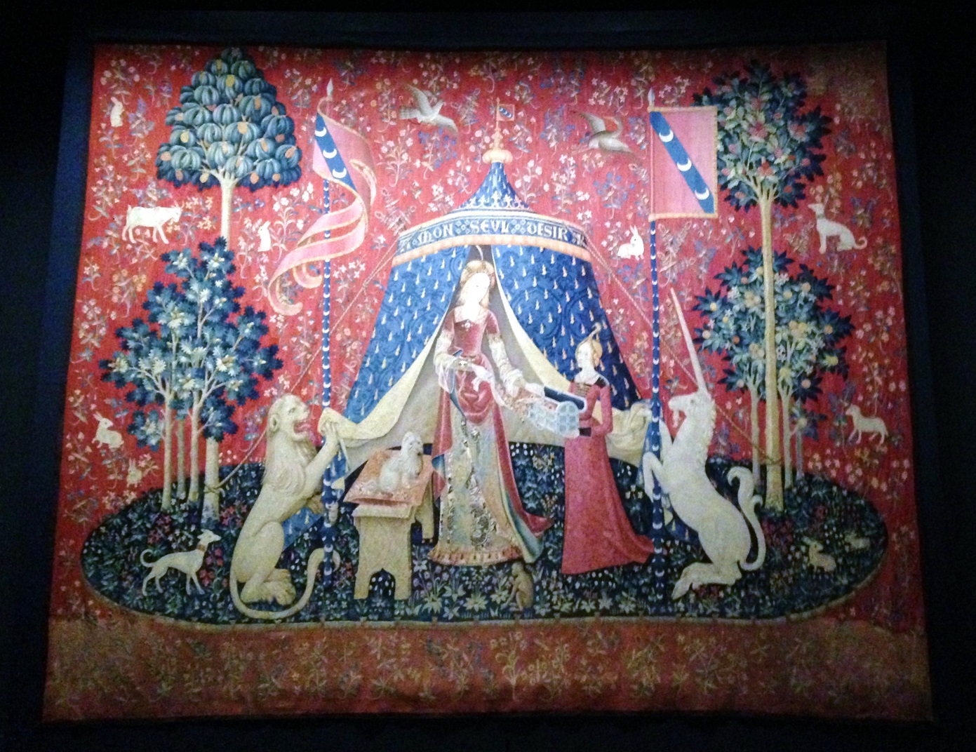 The Lady and the Unicorn is a famous series of six tapestries rediscovered in the 19th century and exhibited at the Cluny Museum…The tapestries are generally thought to have been produced some time in the last two decades of the 15th century…the weaving to have been carried out by one of the workshops of Northern France, Brabant, Flanders or the Netherlands…Since the twenties, historians have recognised an allegory of the five senses in the first five tapestries: Sight; Hearing; Smell; Taste; and Touch. However, the sixth tapestry known as “A Mon Sevl Desir” after the inscription embroidered in gold on a blue pavilion in front of which stand the lady and her maidservant, is not as easily deciphered.