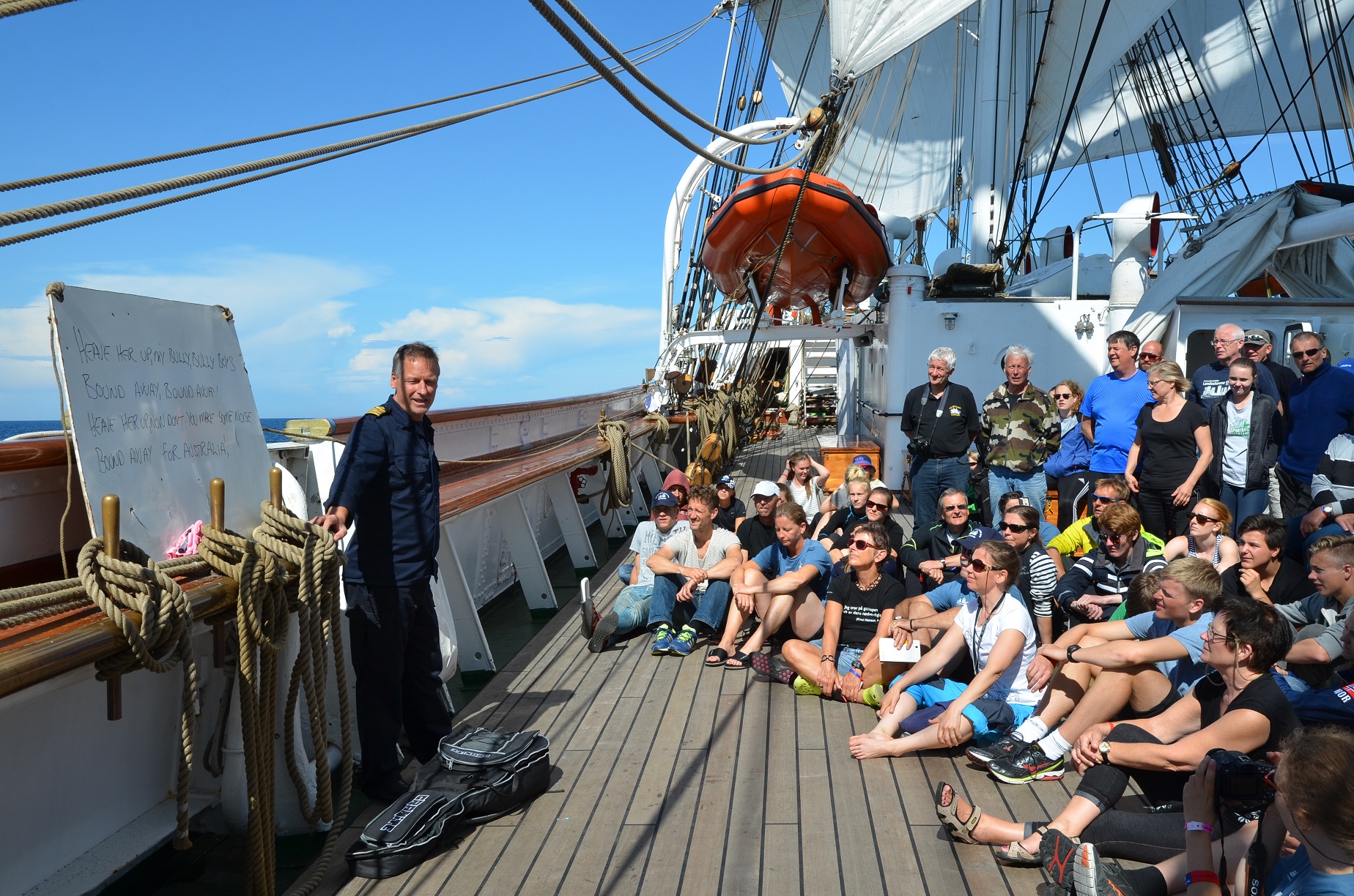 After the official termination of the race was announced at 2 pm yesterday, we decided to continue sailing along the race route and are now on the last leg southwards towards the finishing line off Skagen. We have a nice sailing wind and as the pictures from our visiting photographer from the Danish Fyns Amts newspaper illustrate, the trainees are kept busy on their watch posts and learning seamanship while they enjoy life at sea. Yesterday we were visited by the commander of the Norwegian Coastguard vessel SVALBARD and the Race Director for the Tall Ships Races, who we had invited over for coffee at sea and a shanty session on deck under full sails and sunny skies. We will continue to sail towards The Tall Ships Races Aalborg as long as the wind allows and plan to arrive at 10:00 tomorrow morning.