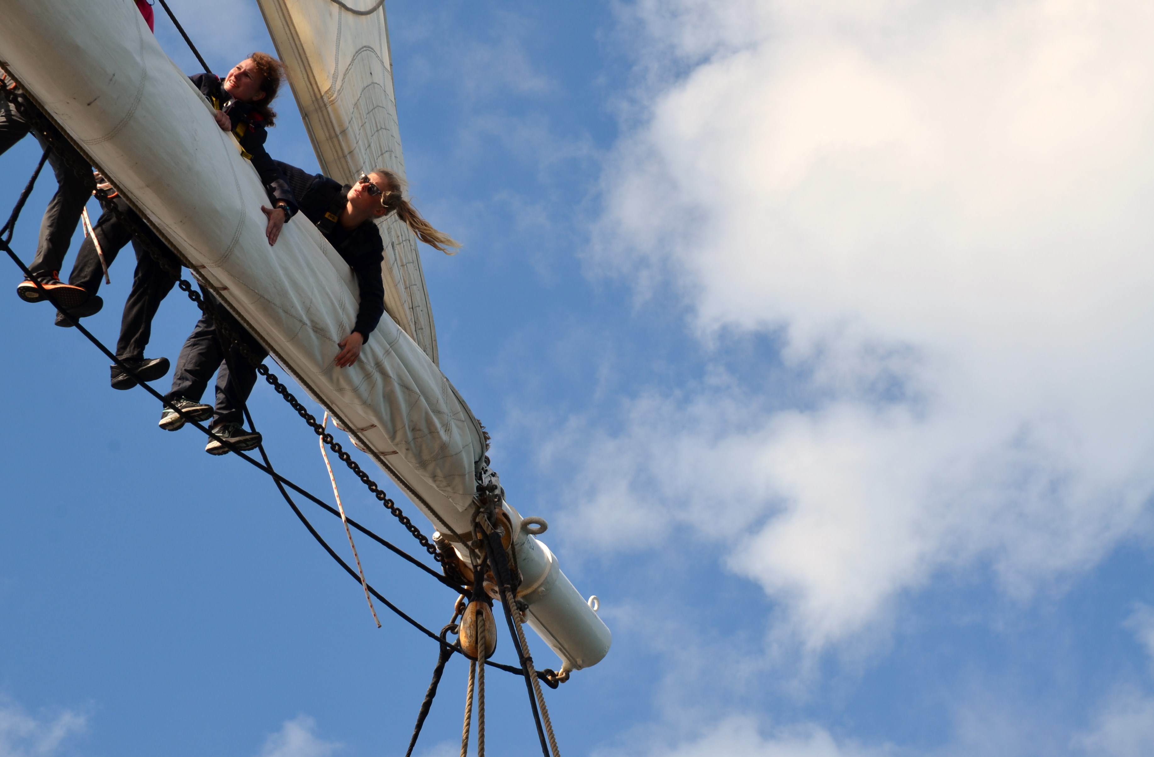 We also continued to learn more shanties. The plan was to load up the yard arms with the cadets and sing our way into port in Aalborg. The sails came down around midnight Friday night and between 8 am and 10 am on Saturday all the trainees were put to work polishing brass and perfectly coiling all ropes.
