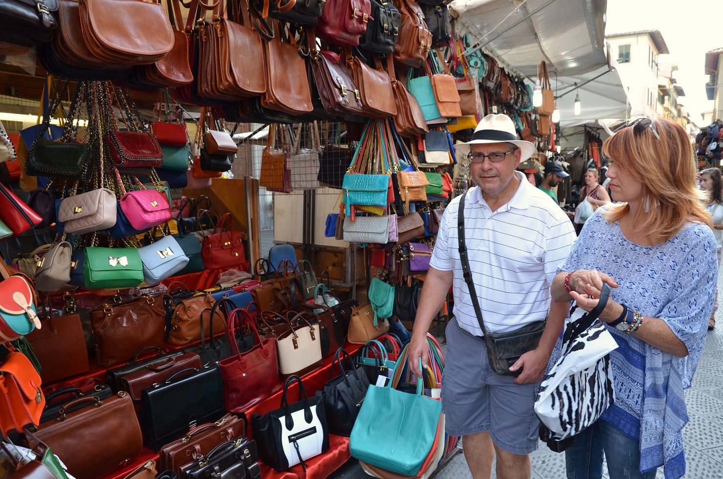 Completely satisfied with a belly full of pasta and new shoes, we cruised by the Uffizi to see how long the wait was for tickets. It was too long, and since I had already toured that museum many years ago, we decided to continue towards the Duomo and then the Galleria dell’Accademia to check out the line for Michelangelo’s David. That line was about a block long and in the sun. Since we were hot and tired, we headed back towards the train station, walking through the outdoor market, making deals on a purse, and stopping for a gelato.