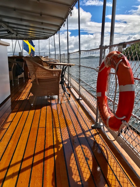 Luckily for us, the M/S Juno – the oldest continuously operating passenger ship in the world – is still traversing  the Göta Canal.  We had booked this cruise late last year.   The Juno was built in 1874 in Motala, Sweden and is 31.45 meters in length, 6.68 meters in width and has a draft of 2.72 meters.  For our sold out cruise, the 29 cabins held 42 Swedes, 4 Germans, and yes, only 2 Americans.
