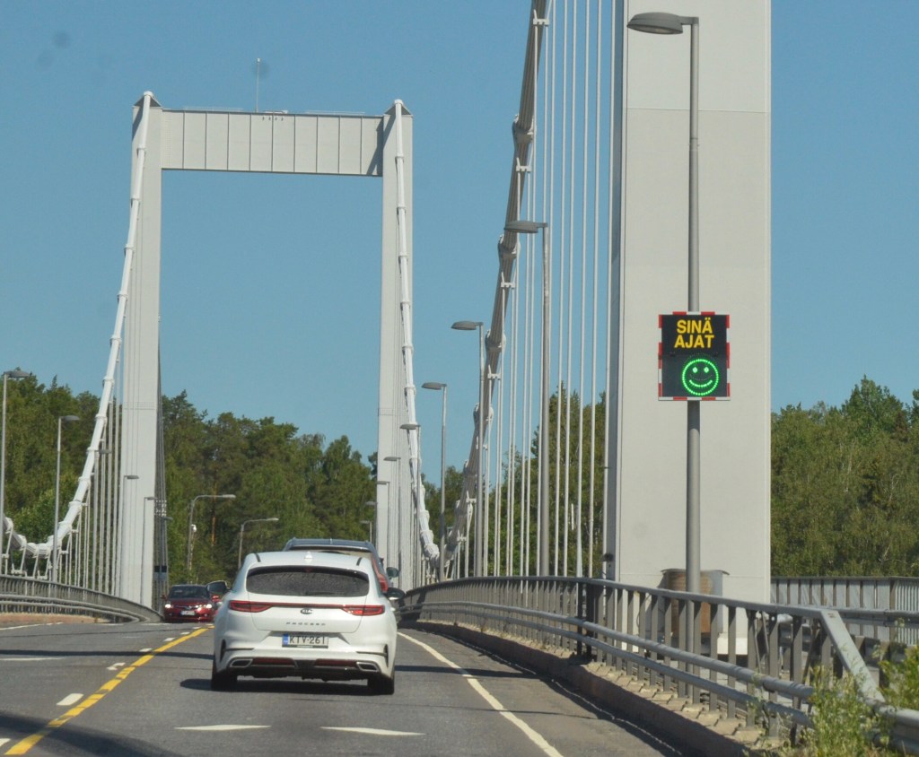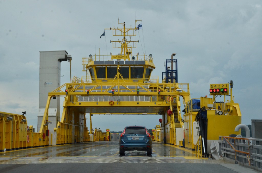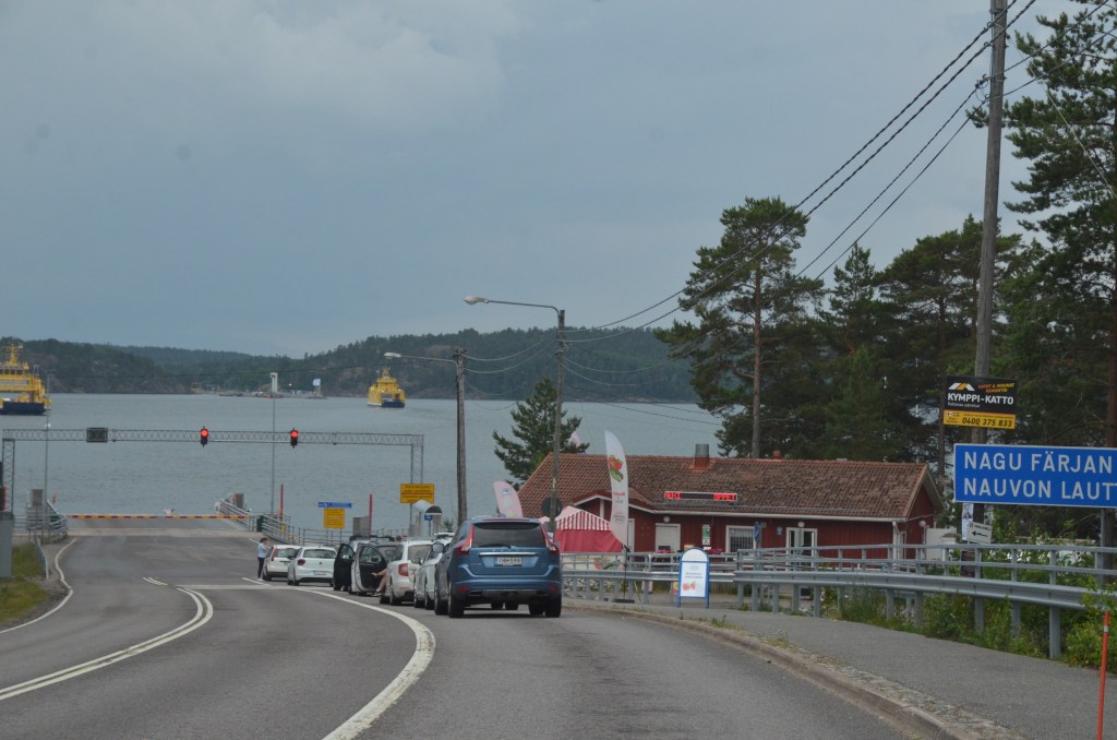 The Finnish archipelago is connected by many bridges and ferries, but we had only one to catch. The ferry between Pargus and Nagu departs every 15 minutes. Our timing was good, and there were only about ten cars lined up. The ferry was automated, lights showing which lane to pull into.
