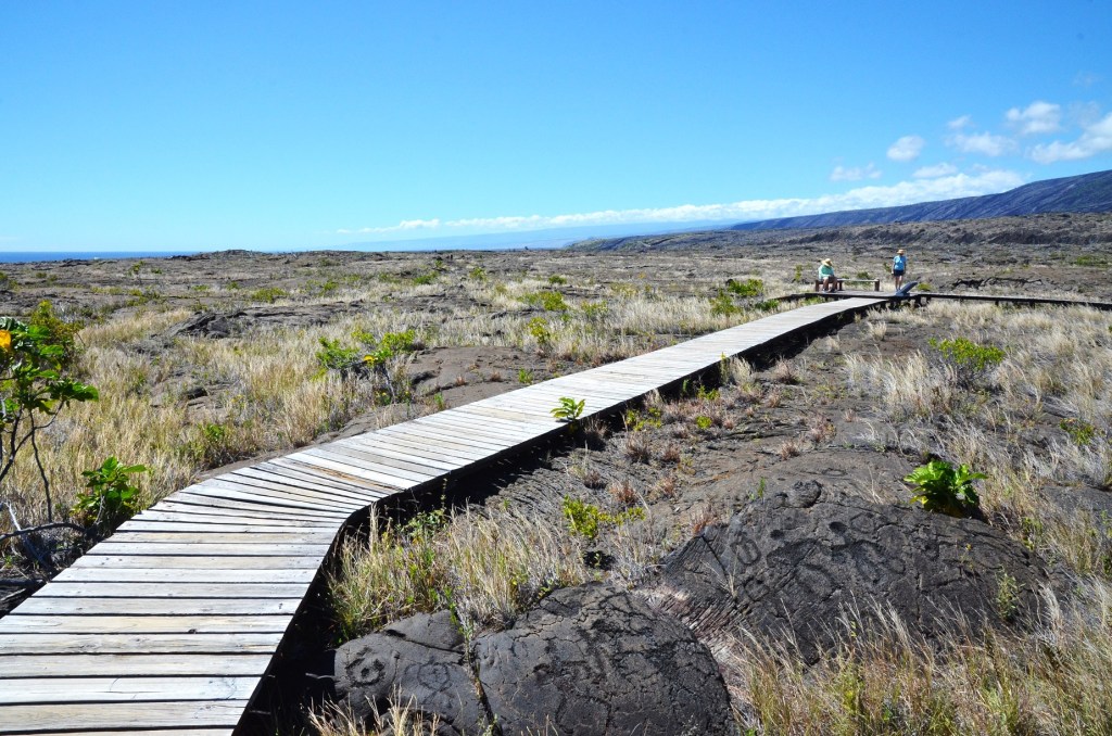 There was an obvious temperature drop between the coastal town of Hilo and the Kilauea Visitor’s Center at 3,980 feet elevation. At times it can be cool, rainy, and cloudy at the entrance of the park and the higher elevation trails. It was quite sunny and warm when we walked the trail to the petroglyphs near the coastline. Five years ago I saw the lava flowing into the sea, but the park is worth a visit even if you don’t see lava flowing.