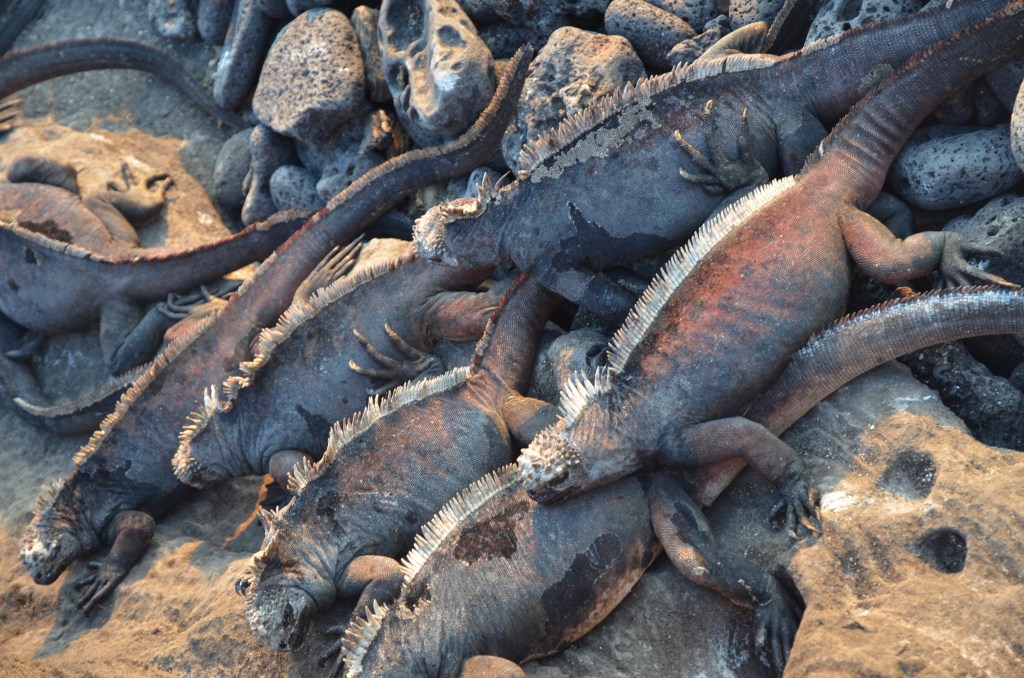 We walked the trail, then the coastline and saw a large sea turtle and a fur seal in the crystal clear grottos formed of broken lava tubes. We also saw many more marine iguanas. As the sun was sinking and we were walking back to the beach for our pick up, we saw a mass of 17 marine iguanas settling in the the night.
