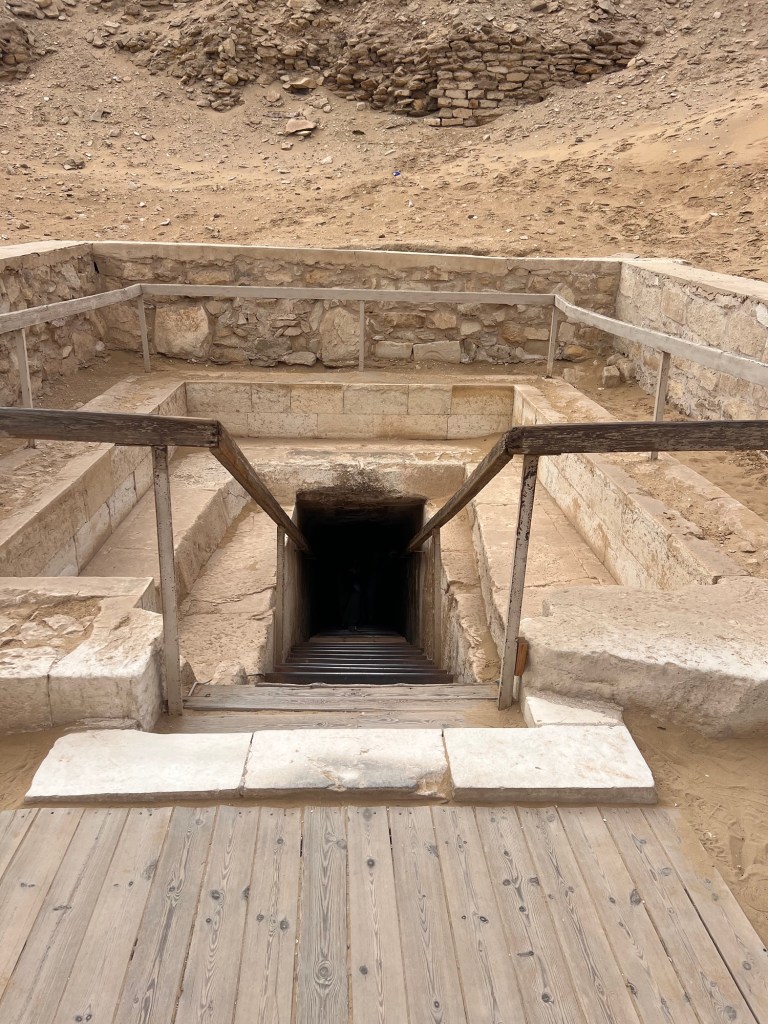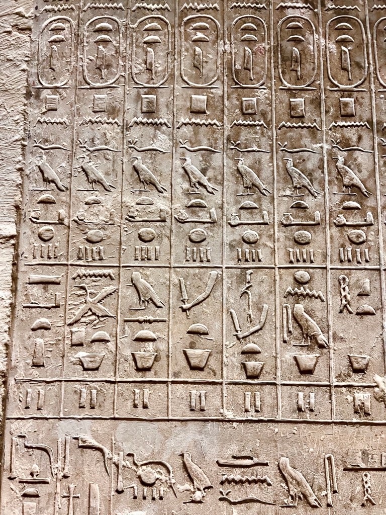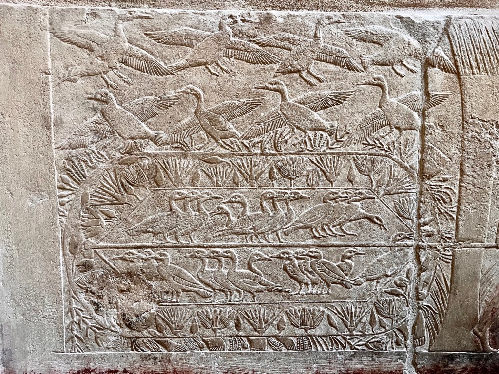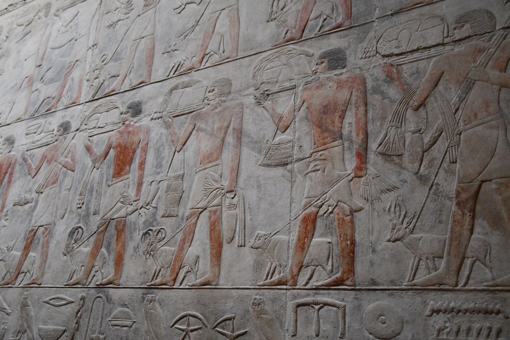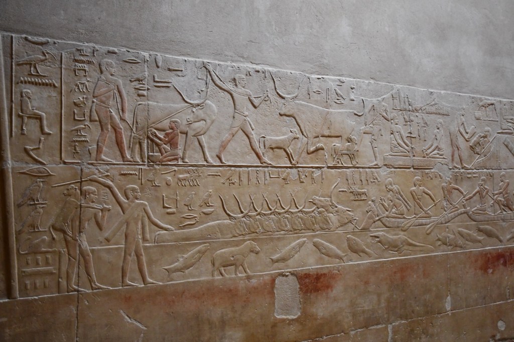 We toured the Tomb of Kagemni in Saqqara, the most well-preserved tomb in Saqqara, dating from Egypt’s Old Kingdom, c. 2345 BCE. The artwork is truly incredible. Our guide, an Egyptologist, explained the meaning of the animals and symbols carved in the stone.