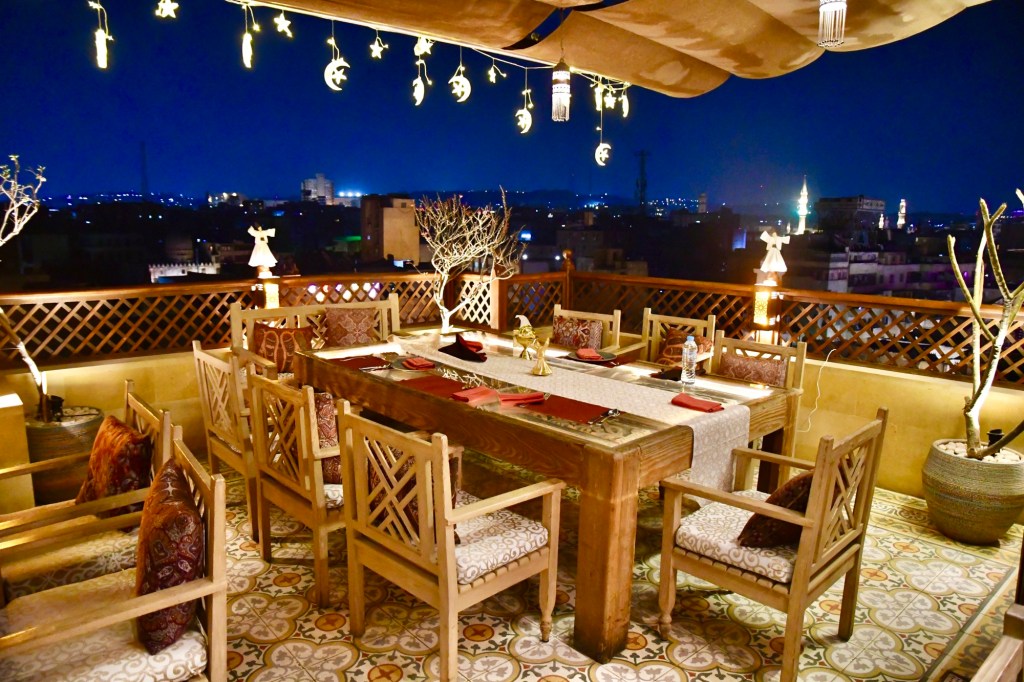 We followed our guide through the Khan el-Khalili market, passing several mosques, through throngs of Ramadan celebrants, dodging dogs and cats and eventually to our dinner location, a rooftop restaurant at a boutique hotel.