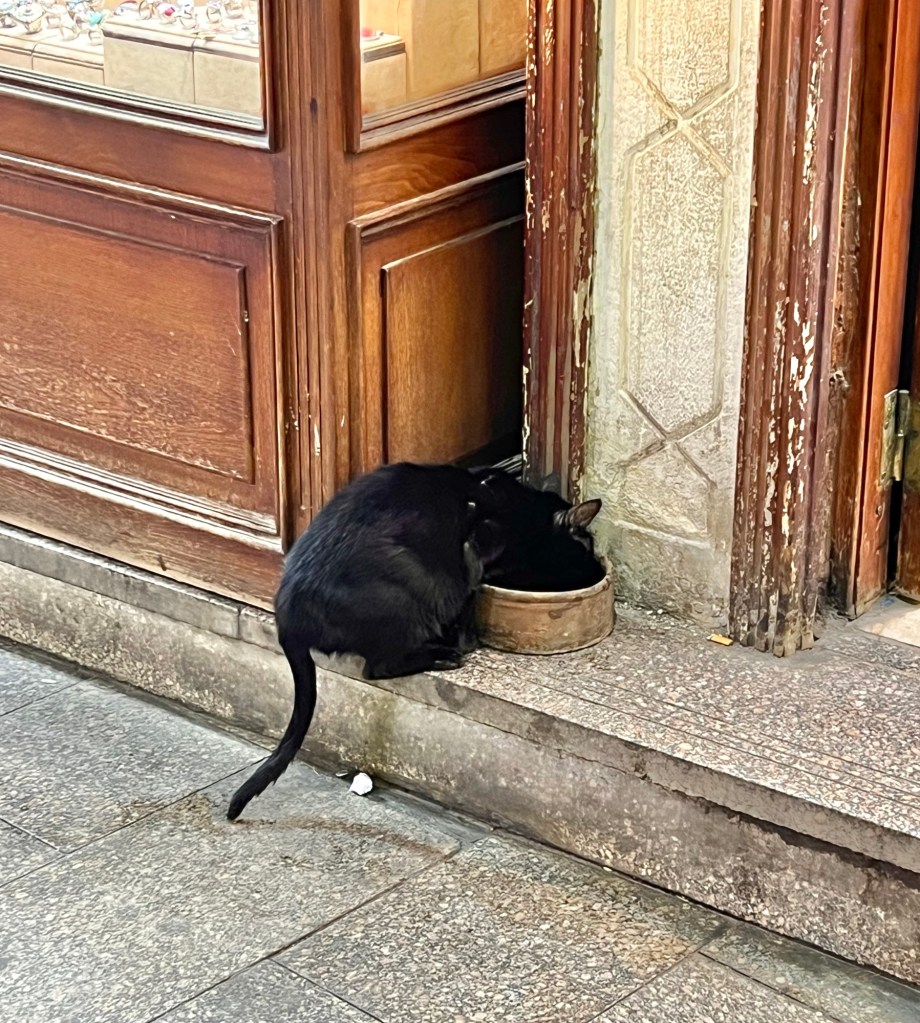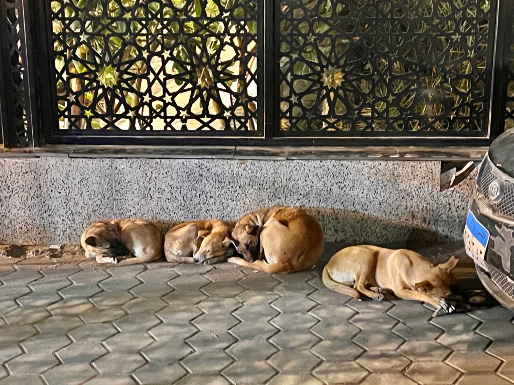 We made our way back to the bus after dinner, stopping for a little shopping in the market. We saw many cats and dogs. Some of the cats were sleeping in the shops, and looked as though they were taken care of. Many looked a bit less cared for, and many looked pregnant. The most heartbreaking for me was a small kitten trying to cross the busy main market street. We also saw a lot of dogs, which mostly looked homeless, sleeping in all sorts of places, sometimes in packs, sometimes alone. During our trek back through the crowded streets we saw three dogs walking in the center of the street looking very casual and unconcerned.