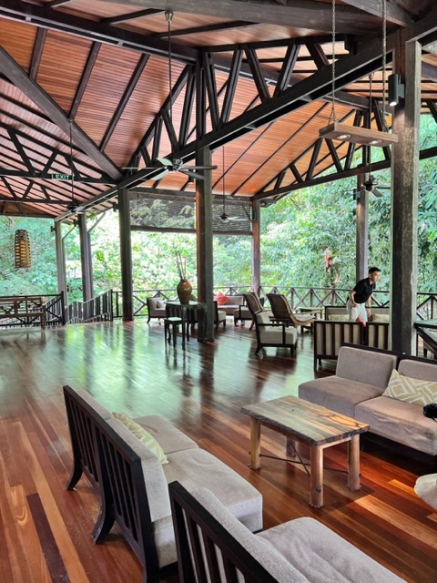 We enjoyed the canopy walk 100 feet in the air, but were seriously dragging. We had a good sighting of a giant red flying tree squirrel gliding between trees, two rhino hornbills, and a raptor. We also saw many of the black squirrels. Being near the tree tops afforded a small breeze at times, and a few towers reached even higher than the canopy trail, but it was all we could do to walk the hour and a half and then return to the lodge. Even a ten minute plunge in the pool was a welcome respite from the heat.