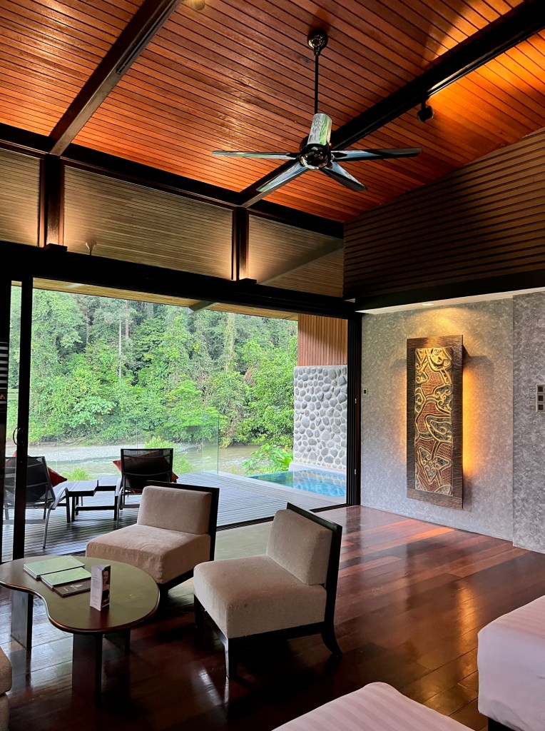 Once at the Lodge, we have lunch and are shown our room. This lodge has been described by the Lonely Planet Borneo guidebook as for “Indiana Jones types with healthy wallets.” Pretty accurate. The rooms are beautiful, the food is good, and the guides are knowledgeable. They also have a proper wine list and real coffee to my delight. No Indiana Jones movie would be complete without a suspension bridge, and there is even one of those.