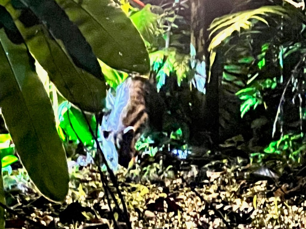There is wildlife in the area surrounding the lodge, you really don’t have to go far. We saw a Malay Civet not far from the lodge entrance. The photo below is not good, but the best I could get, as it was at night, zoomed in with an iPhone. The civet cat was under a landscape light eating bugs.