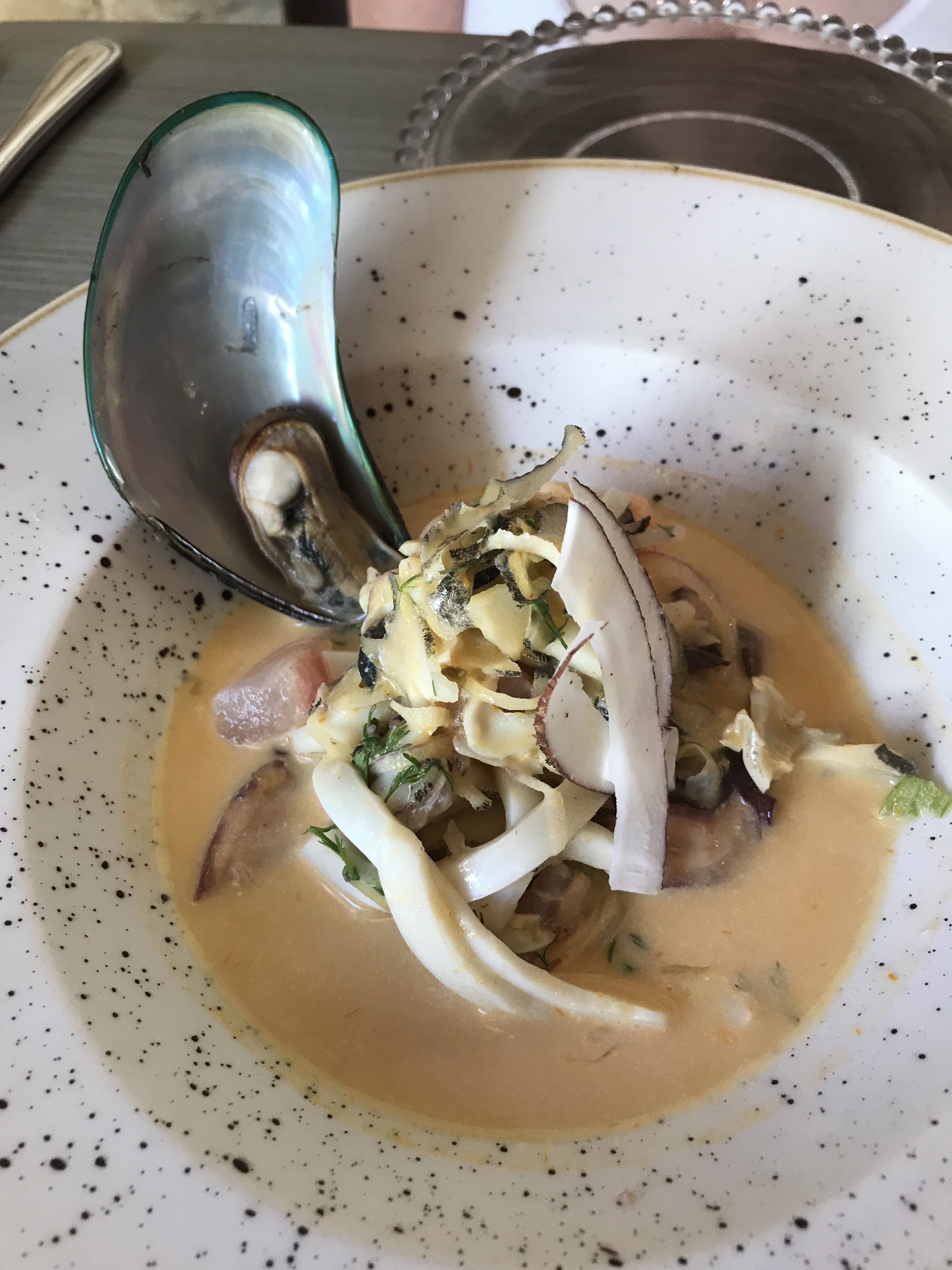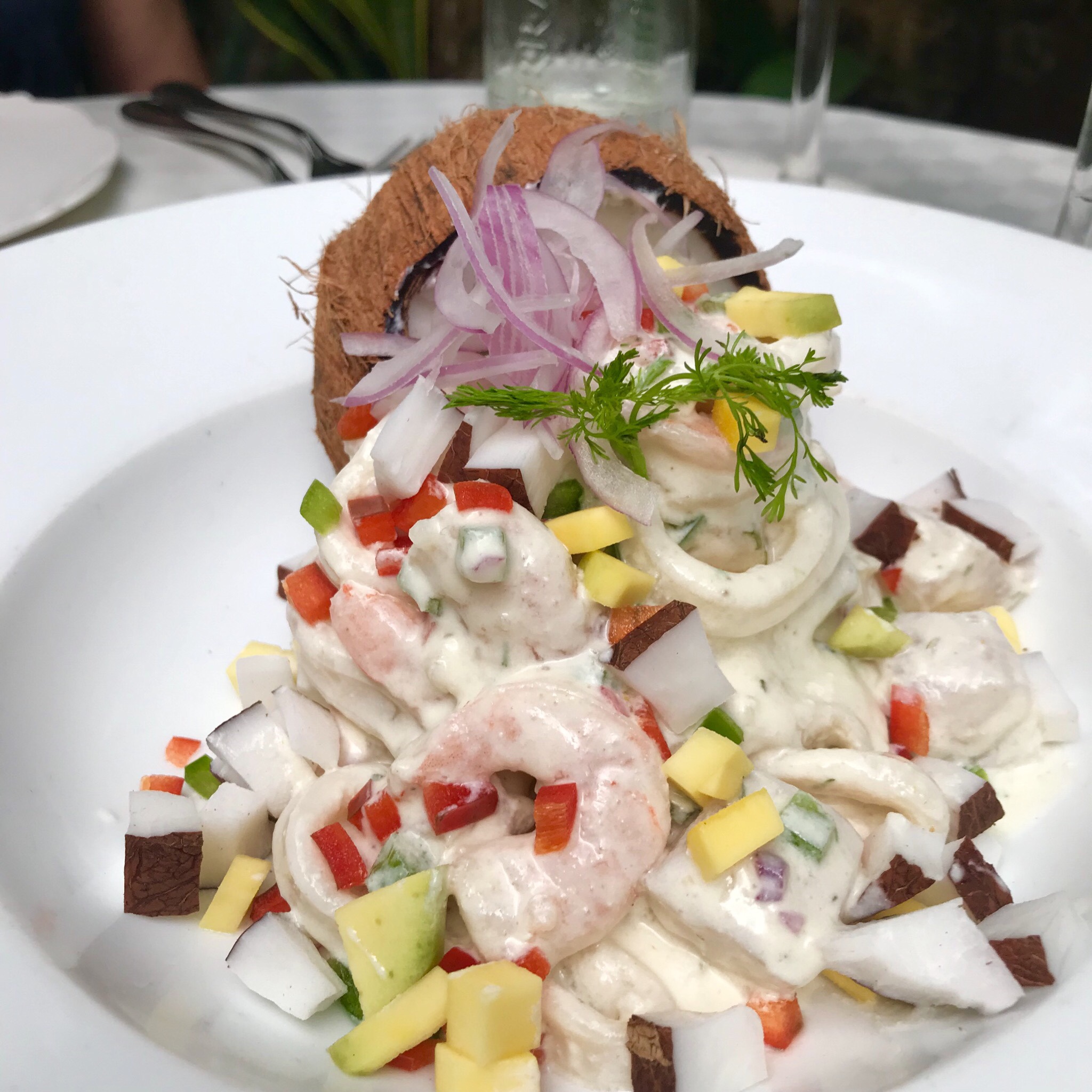Coconut ceviche, white fish, squid, shrimp, octopus, conch, coconut milk, red onion, cilantro, sweet pepper, yellow pepper, and natural coconut.