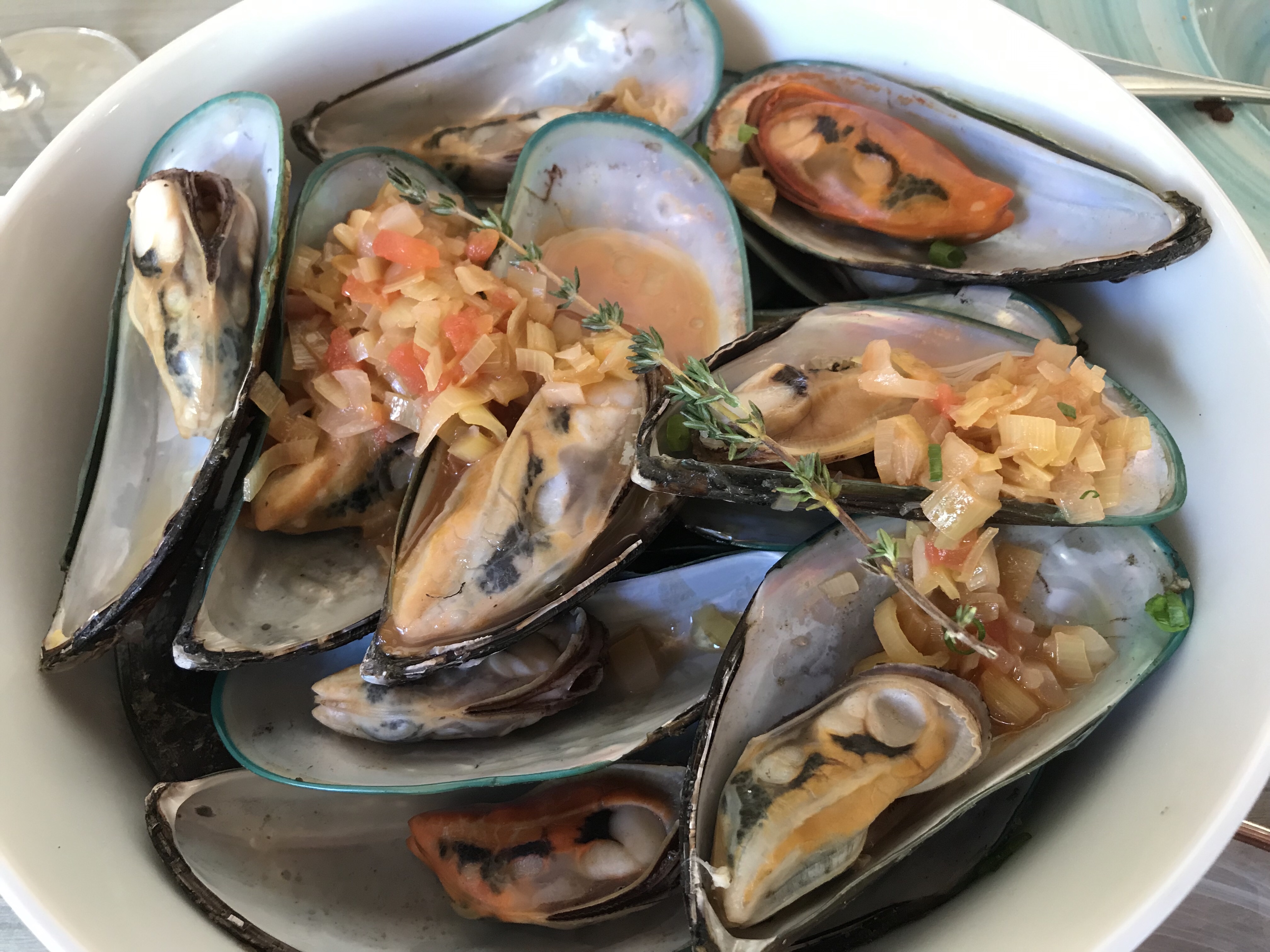 Grilled mussels with gaelico oil and bruschetta.